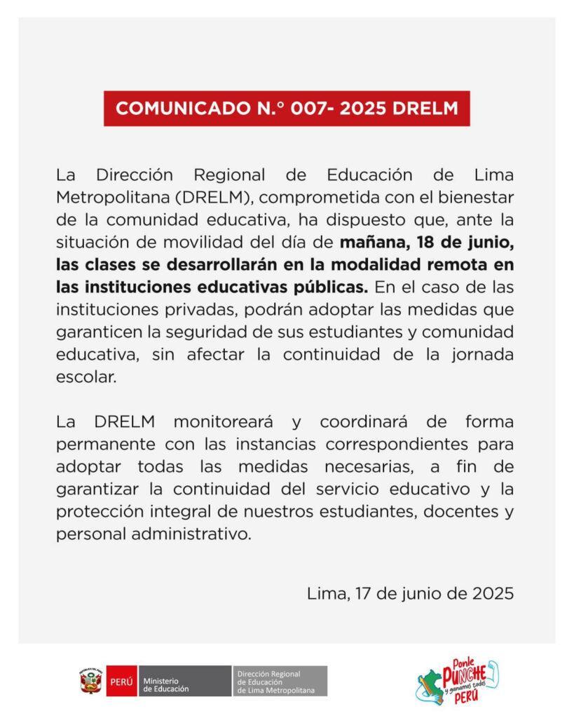 El Instituto de Educación Superior Tecnológico Público “Naciones Unidas” informa a toda la comunidad educativa que, siguiendo las disposiciones emitidas por la Dirección Regional de Educación de Lima Metropolitana (DRELM) mediante el Comunicado N.º 007-2025, las clases del miércoles 18 de junio de 2025 se desarrollarán en la modalidad virtual (remota).